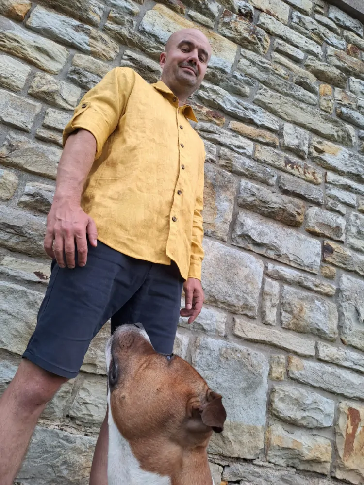 Zářivá pánská košile z velmi kvalitního lnu, s výraznými knoflíčky a kontrastním černým lnem na rukávech, které lze zkrátit díky knoflčku. Vhodná pro celoroční nošení.