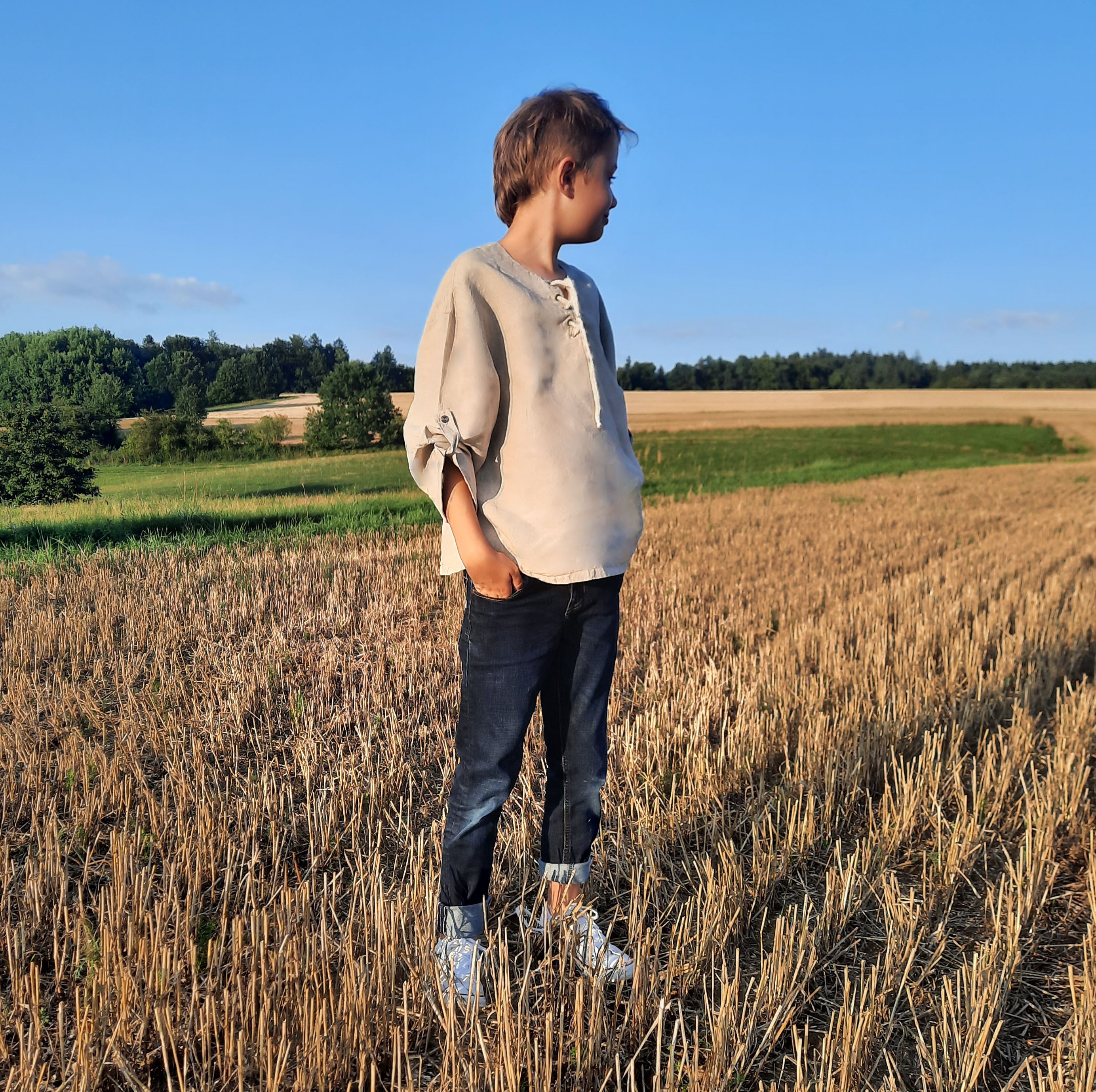 Skvělá režná dětská košile ze lnu. Sněrovačka s dlouhým rukávem, který díky knoflíčku lze zkrátit na krátký. Na jarní a letní dny.