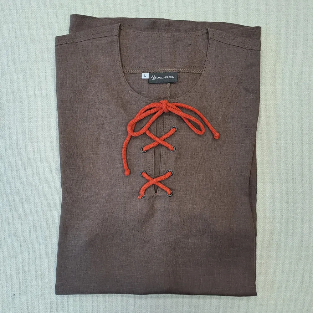 Skvělá režná pánská košile z hnědého lnu. Šněrovačka s KRÁTKÝM rukávem. Pohodlná, vzdušná, nádherná.
