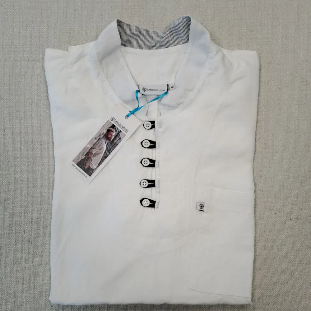 Pánská/UNI košile z nádherného bílého lnu; materiál je tkaný v České republice; košile s dlouhým rukávem s možností zapnutí na kratší rukáv, stojáčkem, 3/4 zapínání na šitá poutka; na jarní a letní dny, velmi příjemná na nošení pro pány na všední i nevšední dny, je jedinečná na moře, na souš, na poušť nebo jen tak...