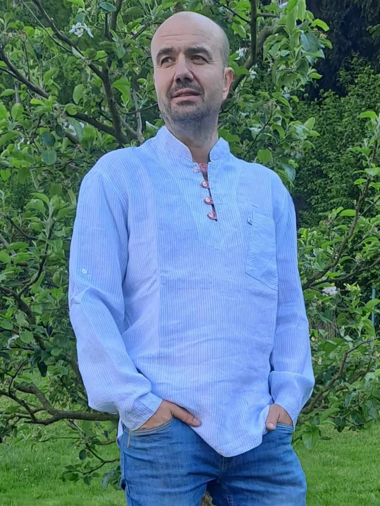Pánská/UNI košile z nádherného proužkovaného modrobílého lnu; materiál je tkaný v České republice; košile s dlouhým rukávem s možností zapnutí na kratší rukáv, stojáčkem, 3/4 zapínání na šitá poutka; na jarní a letní dny, velmi příjemná na nošení pro pány na všední i nevšední dny, je jedinečná na moře, na souš, na poušť nebo jen tak...