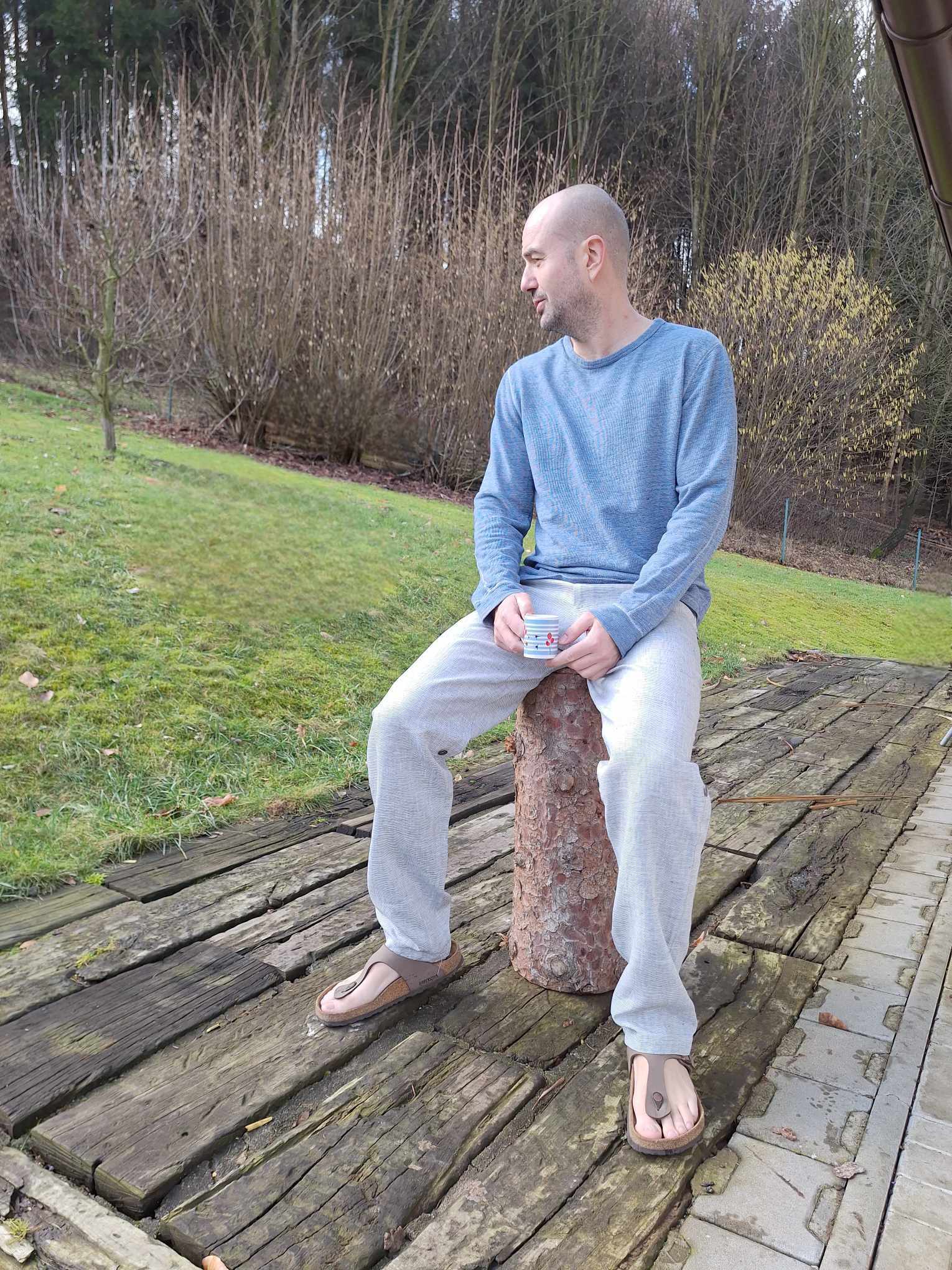 Skvěle padnoucí UNI kalhoty z nádherného proužkovaného šedo-bílého lnu. Možnost zkrácení na 3/4 délku. V pase šňůrka, dvě přední a jedna zadní kapsa.