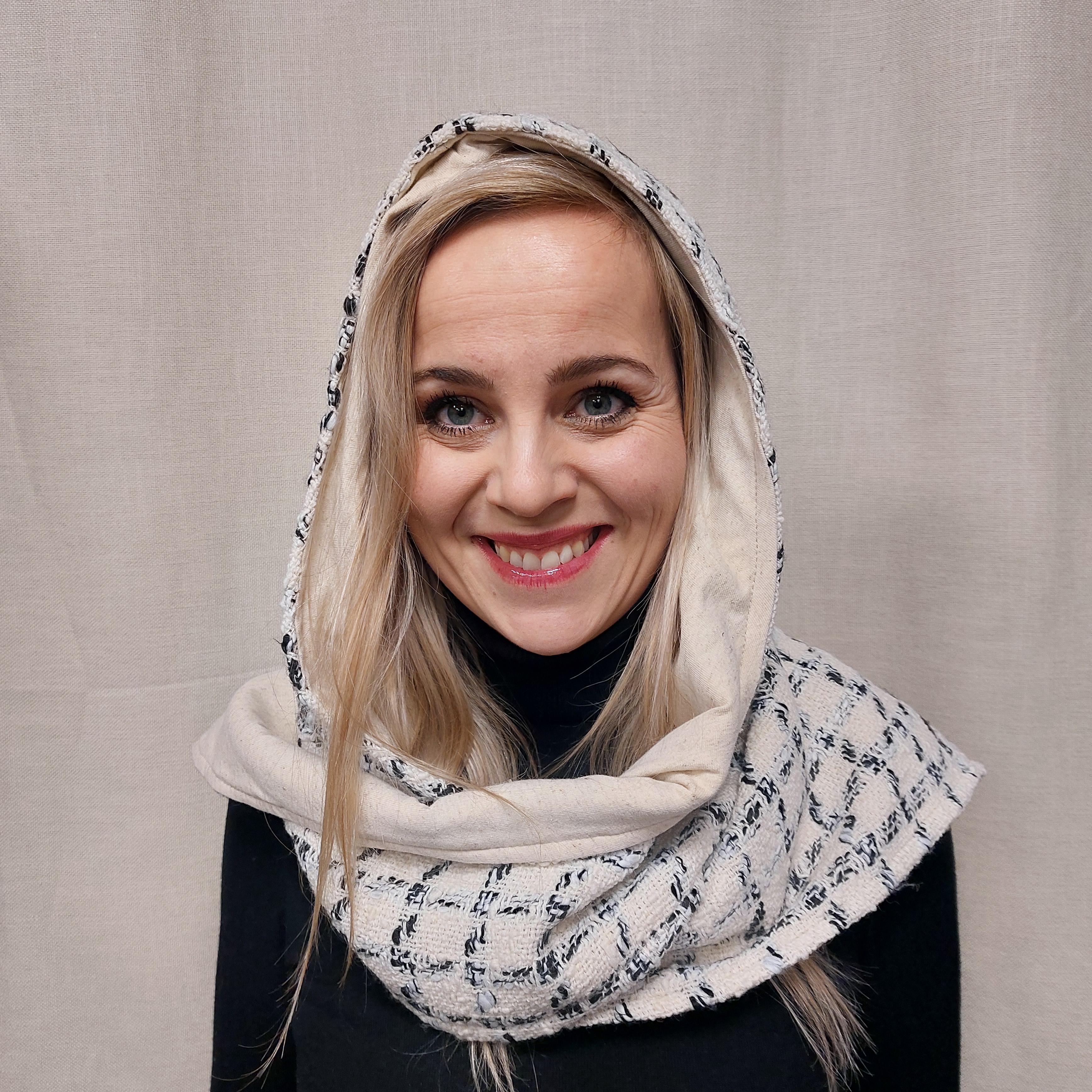 Vypodšitý kapucošál nabízí různé varianty nošení - jako kapuca s dlouhými šály. Kapuca se šály, které se omotají kolem krku a sepnou broží. Či pouze jako velký šál. Překrásně se hodí k nošení v chladnějších či chladných dnech místo čepic, ke svetrům, kabátům, sakům. Pro všední i nevšední dny. Kapucošál je OBOUSTRANNÝ.