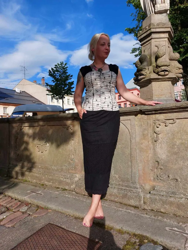 ŽIVŮTEK/TOP z nádherné černé a potištěné bavlny s motivem notiček/kočiček. Zadní díl a ramínka živůtku jsou žabičková. Jeho přední část je rozdělena šňůrkou, která umožňuje jeho různorodost, velmi příjemně se nosí jak v létě tak v čase svetrů, šátků a šál, pro všední i nevšední dny.
